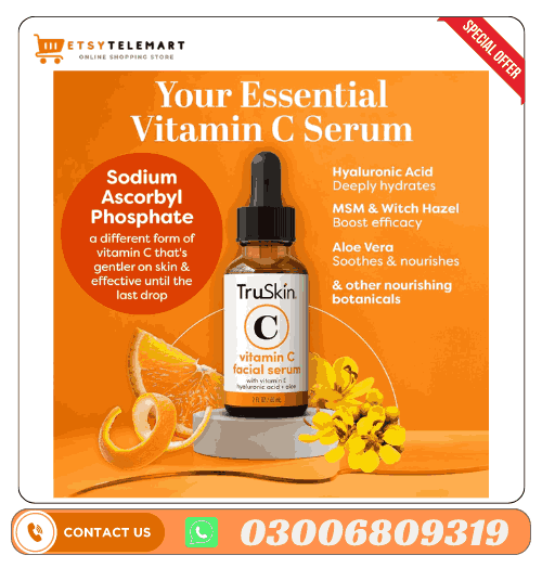 Shop Truskin Vitamin C Serum in Pakistan at Etsytelemart.com.pk. Dermatologist-approved, with Vitamin C, Hyaluronic Acid, Vitamin E, Aloe Vera & MSM. Brightens skin, reduces dark spots, hydrates & fights aging. Call 03006809319.